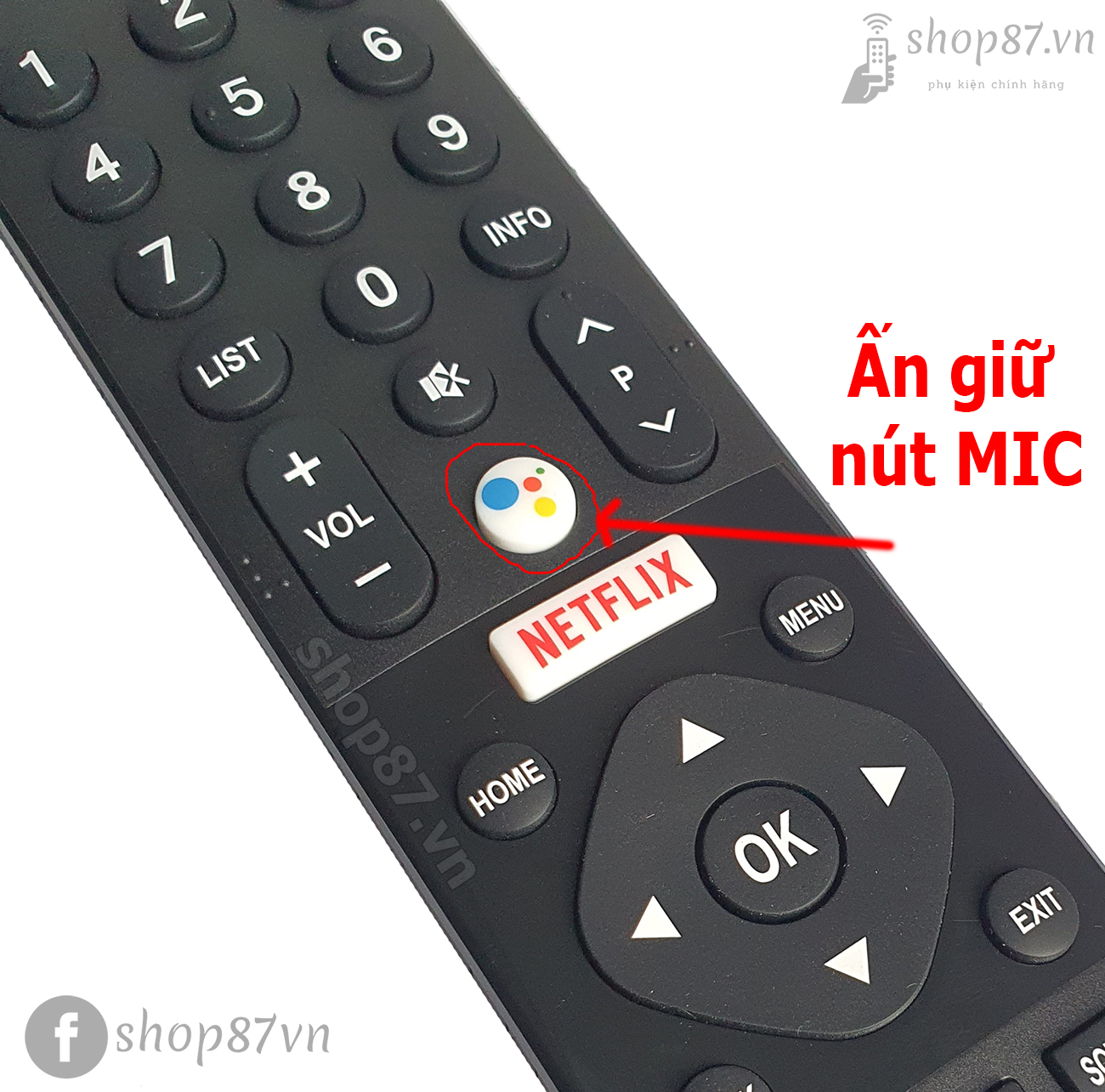 Bước 1: Trên remote điều khiển, bạn ấn giữ nút MIC ( nút ra lệnh bằng giọng nói ).